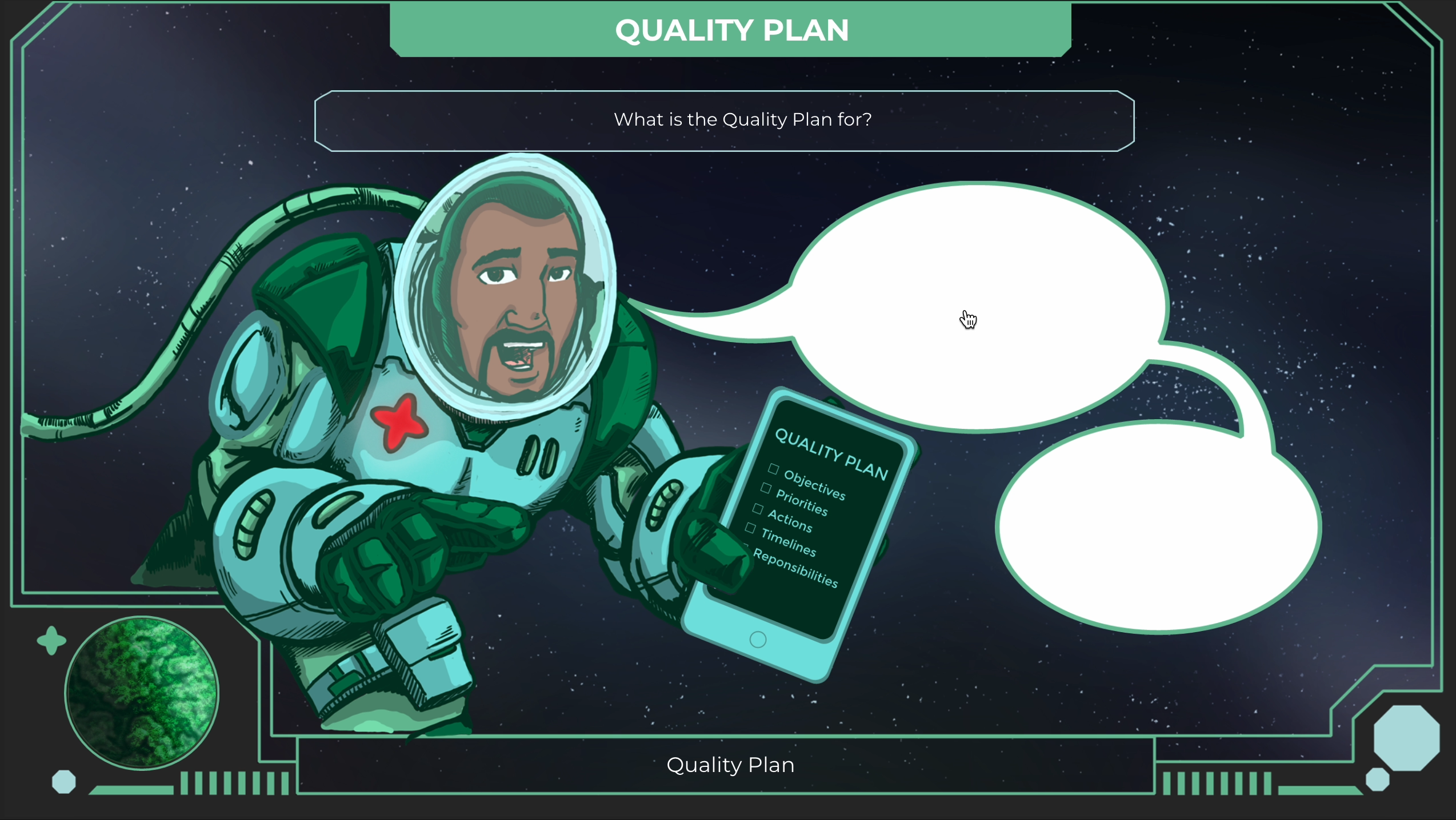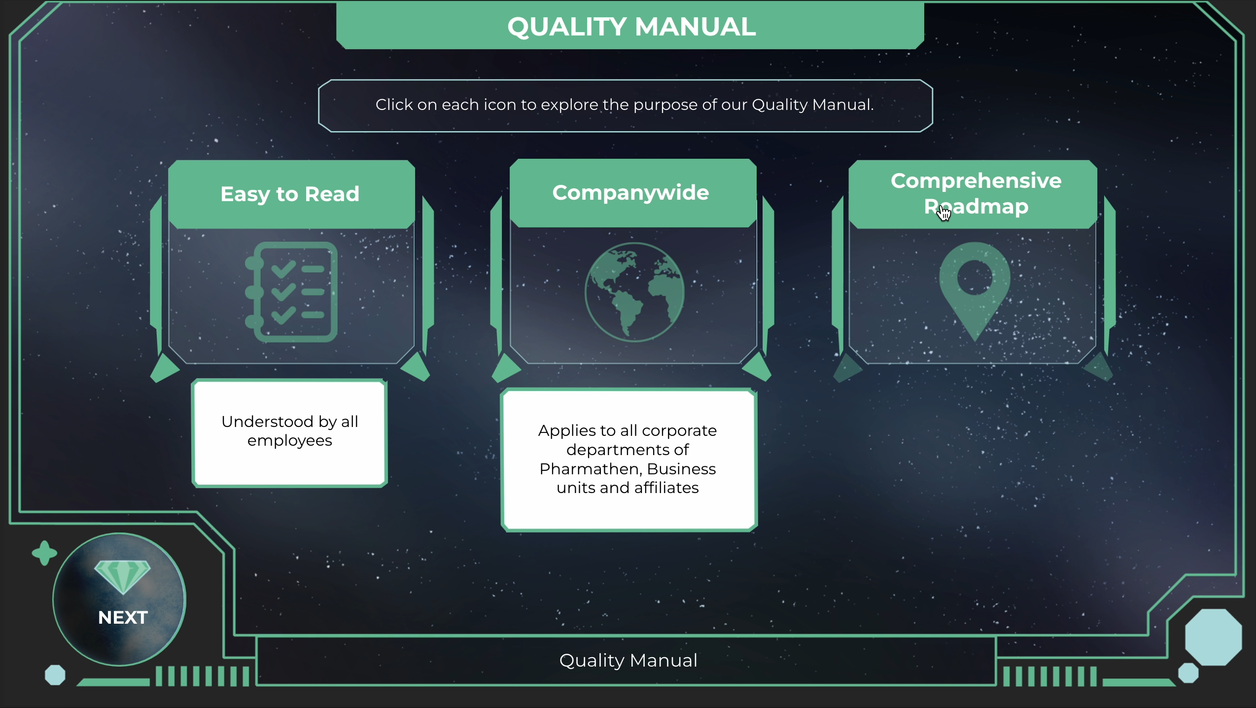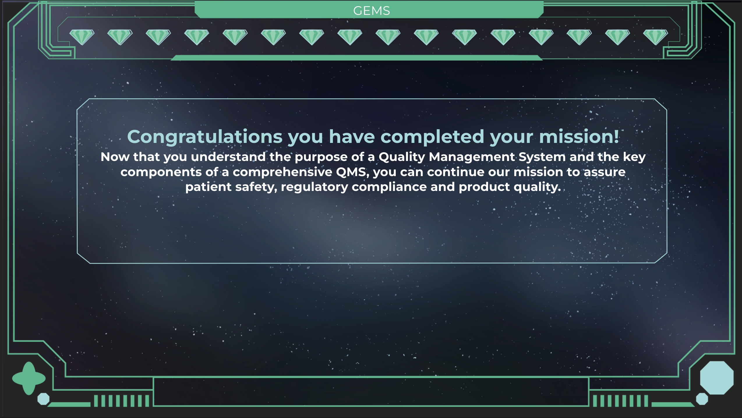 While collaborating with King and I Learn, I partnered with Pharmathen to create eLearning experiences that transformed regulatory and quality topics into something truly imaginative. One standout course took the shape of a space exploration adventure, where learners traveled to 16 custom-designed planets, collected gems, and explored quality management through interactive HUDs, sci-fi visuals, and free-roam learning. Across multiple projects, I focused on designing colorful interfaces, icons, and characters that turned even the most technical subjects into fun, visually rich experiences.